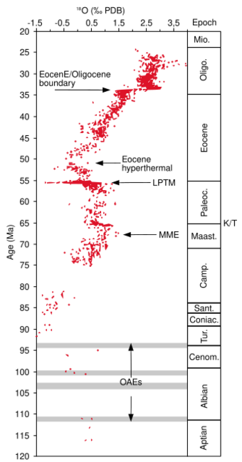 A study in 2020 estimated the global mean surface temperature (GMST) with 66% confidence during the latest Paleocene (c. 57 Ma) as 22.3–28.3 °C (72.1–82.9 °F), PETM (56 Ma) as 27.2–34.5 °C (81.0–94.1 °F) and Early Eocene Climatic Optimum (EECO) (53.3 to 49.1 Ma) as 23.2–29.7 °C (73.8–85.5 °F).[15] Estimates of the amount of average global temperature rise at the start of the PETM range from approximately 3 to 6 °C[16] to between 5 and 8 °C.[2] This warming was superimposed on "long-term" early Paleogene warming, and is based on several lines of evidence. There is a prominent (>1‰) negative excursion in the δ18O of foraminifera shells, both those made in surface and deep ocean water. Because there was little or no polar ice in the early Paleogene, the shift in δ18O very probably signifies a rise in ocean temperature.[17] The temperature rise is also supported by the spread of warmth-loving taxa to higher latitudes,[18] changes in plant leaf shape and size,[19] the Mg/Ca ratios of foraminifera,[16] and the ratios of certain organic compounds, such as TEXH86.[20]