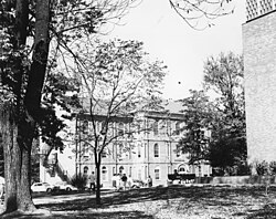 In 1863 three brothers, Hugh, James, and Thomas Garvin founded Franklin College in Albany, Ohio. After two years in Albany, the college was relocated to Wilmington, where the cornerstone of College Hall was laid on 4 July 1866. The institution was closed in 1868 following the Civil War. In 1870 the half-completed Franklin College building went up for auction. The building and 33 surrounding acres were purchased by the Religious Society of Friends (Quakers). Lewis Estes was named the first president. Following a few years of economic struggle, Estes resigned. Benjamin Trueblood, a 26-year-old recent Earlham College graduate, was named the new president. In 1875, Wilmington College graduated its first class of four students, three females, and one male. South Hall (razed 1956) was the college's first dorm in 1876, and in 1904 the college purchased a former boarding house and named it Twin Ash Hall (demolished 1984).