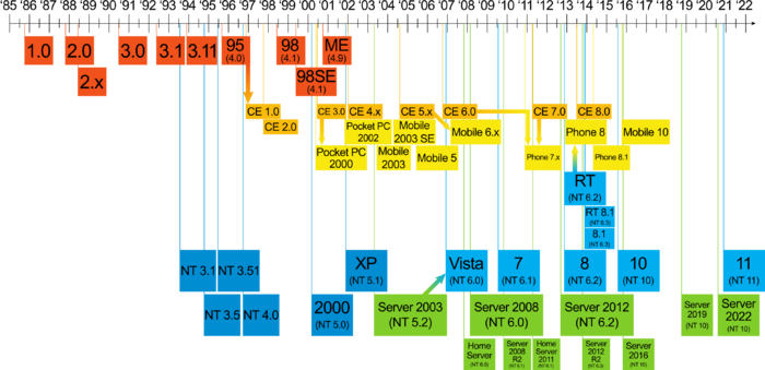 (As of 2024) the only active top-level family is Windows NT. The first version, Windows NT 3.1, was intended for server computing and corporate workstations. It grew into a product line of its own and now consists of four sub-families that tend to be released almost simultaneously and share the same kernel.