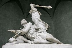 Following the fire in 1713, the village square (Dorfplatz) was fully rebuilt, to its current unified appearance, in 1715 according to a plan by Josef Aebi and Ludwig Gassmann. The square now houses the Winkelried fountain and the sculpture Der Tod und das Mädchen (Death and the Maiden). The Winkelried monument was carved from Carrarain marble in Rome and then shipped by boat, rail and horse team to Stans in 1865.[14] The monument is in a Gothic Revival style and was carved by Ferdinand Schlöth. Death and the Maiden was done by Rudolf Brem.[15]