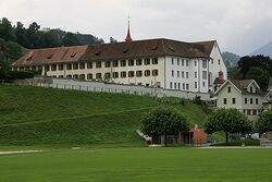 A Capuchin monastery was established in Stans in 1583 by Melchior Lussy, who had been sent to the Council of Trent. Initially there was resistance to the poverty, simple habits and beards of this order of Counter-Reformation monks.[14] In 1777 the monks opened a Latin school, which was suppressed from 1798 until 1803 under the Helvetic Republic. The Kollegium St. Fidelis was built by the monks in 1895 and purchased by the canton in 1988. The monastery church was built in 1683 and renovated in 1980.[15] In 1956 a memorial tablet to Melchoir Lussy was placed near the gate of the monastery.