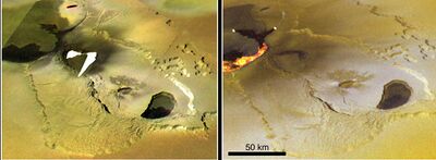 From Handwiki This is a list of active, dormant, and extinct volcanoes located beyond planet Earth. They may be designated mons (mountain), patera (an irregular crater) or tholus (small mountain or hill) in accordance with the International Astronomical Union's rules for planetary nomenclature. Many of them are nameless.