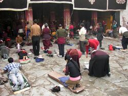 thumb|Tibet: An elderly Tibetan woman holding a prayer wheel on the Lhasa's pilgrimage circuit of Barkhor. The Barkhor, a quadrangle of streets that surrounds the Jokhang Temple, is both the spiritual heart of the holy city and the main commercial district for Tibetans.