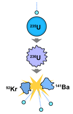 Protons and neutrons behave almost identically under the influence of the nuclear force within the nucleus. They are therefore both referred to collectively as nucleons.[10] The concept of isospin, in which the proton and neutron are viewed as two quantum states of the same particle, is used to model the interactions of nucleons by the nuclear or weak forces. Because of the strength of the nuclear force at short distances, the binding energy of nucleons is more than seven orders of magnitude larger than the electromagnetic energy binding electrons in atoms. Nuclear reactions (such as nuclear fission) therefore have an energy density that is more than ten million times that of chemical reactions. Because of the mass–energy equivalence, nuclear binding energies reduce the mass of nuclei. Ultimately, the ability of the nuclear force to store energy arising from the electromagnetic repulsion of nuclear components is the basis for most of the energy that makes nuclear reactors or bombs possible. In nuclear fission, the absorption of a neutron by a heavy nuclide (e.g., uranium-235) causes the nuclide to become unstable and break into light nuclides and additional neutrons. The positively charged light nuclides then repel, releasing electromagnetic potential energy.