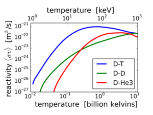 D–T (deuterium–tritium) fusion is the fusion reaction that produces the most energetic neutrons, with 14.1 MeV of kinetic energy and traveling at 17% of the speed of light. D–T fusion is also the easiest fusion reaction to ignite, reaching near-peak rates even when the deuterium and tritium nuclei have only a thousandth as much kinetic energy as the 14.1 MeV that will be produced.