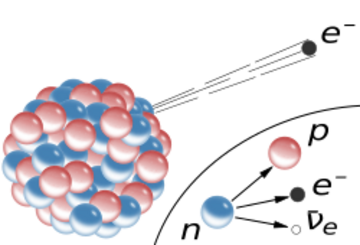 The electron and positron produced in these reactions are historically known as beta particles, denoted β− or β+ respectively, lending the name to the decay process. In these reactions, the original particle is not composed of the product particles; rather, the product particles are created at the instant of the reaction.