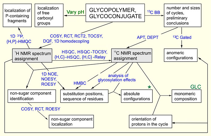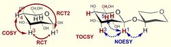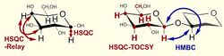 Complex glycans possess a multitude of overlapping signals, especially in a proton spectrum. Therefore, it is advantageous to utilize 2D experiments for the assignment of signals. The table and figures below list most widespread NMR techniques used in carbohydrate studies.