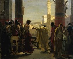 According to the gospel accounts Jesus taught in Jerusalem, and he caused a disturbance at the Temple.[213] In response, the temple authorities arrested him and turned him over to the Roman authorities for execution.[213] He might have been betrayed into the hands of the temple police, but Funk suggests the authorities might have arrested him with no need for a traitor.[213]