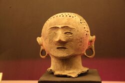 So far, there have been four classified kinds of cover and lid: (1) Anthropomorphic motif or head, (2) Trunconical with simple appliquéd design, (3) Simple ovaloid with four ear handles, and (4) Trunconical with adz shape and round spinning shape motif. While there are three types of heads: (1) Plain, (2) Perforated, and (3) Painted red and black from hematite and organic material. The black paint may indicate where the hair of the dead has once been.[1]