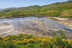 Oil can reach the oceans as oil and fuel from land-based sources.[30] It is estimated that runoff oil and oil from rivers are responsible for 11% of oil pollution to the oceans.[34] Such pollution can also be oil on roads from land vehicles, which is then flushed into the oceans during rainstorms.[33] Purely land-based oil spills are different from maritime oil spills in that oil on land does not spread as quickly as in water, and effects thus remain local.[30]