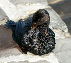 Animals who rely on scent to find their babies or mothers cannot do so due to the strong scent of the oil. This causes a baby to be rejected and abandoned, leaving the babies to starve and eventually die. Oil can impair a bird's ability to fly, preventing it from foraging or escaping from predators. As they preen, birds may ingest the oil coating their feathers, irritating the digestive tract, altering liver function, and causing kidney damage. Together with their diminished foraging capacity, this can rapidly result in dehydration and metabolic imbalance. Some birds exposed to petroleum also experience changes in their hormonal balance, including changes in their luteinizing protein.[14] The majority of birds affected by oil spills die from complications without human intervention.[15][16] Some studies have suggested that less than one percent of oil-soaked birds survive, even after cleaning,[17] although the survival rate can also exceed ninety percent, as in the case of the MV Treasure oil spill.[18] Oil spills and oil dumping events have been impacting sea birds since at least the 1920s[19][20][21] and was understood to be a global problem in the 1930s.[22]