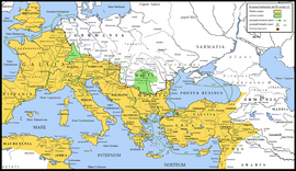 Historians differ as to the dates for the beginning and ending of the Migration Period. The beginning of the period is widely regarded as the invasion of Europe by the Huns from Asia in about 375 and the ending with the conquest of Italy by the Lombards in 568,[4] but a more loosely set period is from as early as 300 to as late as 800.[5] For example, in the 4th century a very large group of Goths was settled as foederati within the Roman Balkans, and the Franks were settled south of the Rhine in Roman Gaul. In 406 a particularly large and unexpected crossing of the Rhine was made by a group of Vandals, Alans and Suebi. As central power broke down in the Western Roman Empire, the military became more important but was dominated by men of barbarian origin.