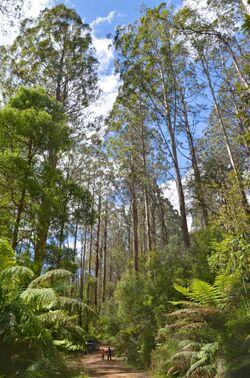 The East Victorian Central Highlands, including some of Melbourne's water catchments, contain cool temperate rainforests; dominated by myrtle beech and southern sassafras,[2] with an understorey of ferns and mosses. They may also contain eucalypt trees and blackwood.[3]