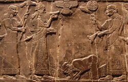 Herodotus reported that the ancient Persians called all of the Scythians Sacae, but they called themselves Scoloti. However, a modern comparison of the forms which are given in other ancient languages suggests that Skuda was their name.[33] Ancient writers, such as Josephus and Jerome would associate the Scythians with the peoples of Gog and Magog,[34] but British Israelist etymologists would see in Sacae a name derived from the biblical "Isaac",[25]: 294–295 claiming that the appearance of the Scythians where they claimed the Lost Tribes were last documented also supported a connection.[17] Further, British Israelists find support in the superficial resemblance between King Jehu's pointed headdress and that of the captive Saka king seen to the far right on the Behistun Rock.[35] The chain of etymological identification leading from Isaac to the Sacae was continued to the Saxons (interpreted as "Sac's sons" – the sons of Isaac),[25]: 294–295 [9]: 21 [36]: 121 who are portrayed as invading England from Denmark , the 'land of the Tribe of Dan'.[17] They saw the same tribal name, left by the wanderers, in the Dardanelles, the Danube, Macedonia, Dunkirk, Dunglow in Ireland, Dundee in Scotland, Sweden and London,[3][37][38][39] and ascribed to this lost tribe the mythical Irish Tuatha Dé Danann.[17] In the name of the British they see berithish, referring to the Hebrew covenant with God.[3]