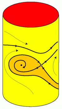 State space is the set of all possible states of a dynamical system; each state of the system corresponds to a unique point in the state space. For example, the state of an idealized pendulum is uniquely defined by its angle and angular velocity, so the state space is the set of all possible pairs "(angle, velocity)", which form the cylinder \(S^1 \times \R\ ,\) as in Figure 1.
