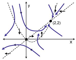 Consider the system \[ \begin{matrix} x' & = & y-x^2 + x \\ y' & = & x-y. \end{matrix} \] Note that there are two equilibria; these are at \((0,0)\) and \((2,2)\ .\) Using the linearization method, we find that \((0,0)\) is a saddle and \((2,2)\) is a stable node. A useful way to analyze the phase plane is to draw the nullclines. The \(x\)-nullcline is where \(x'=0\ ;\) this is the curve \(y=x^2-x\ .\) Along the \(x\)-nullcline, the vector field points either up or down, depending on the sign of \(y'\ .\) The \(y\)-nullcline is where \(y'=0\ ;\) this is the curve \(y=x\ .\) Along the \(y\)-nullcline, the vector field points to the left or to the right, depending on the sign of \(x'\ .\) Note that the nullclines divide the phase plane into separate regions; all of the vectors within a given region point towards the same quadrant. Once we have located the equilibria and have drawn the nullclines, it is usually possible to predict the behavior of the solution with some prescribed initial condition.