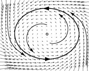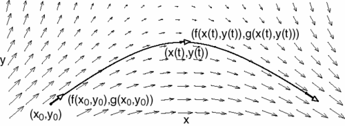 Of course, not every arbitrarily drawn curve in the phase plane represents a solution. What is special about solution trajectories is that the velocity vector at each point along the trajectory is given by the right hand side of the differential equation above. That is, the velocity vector of the trajectory \((x(t), y(t))\) at a point \((x(p), y(p))\) is given by \((x', y') = (f(x(p),y(p)), g(x(p),y(p)))\ .\) This geometric property -- that the vector \((f(x,y), g(x,y))\) always points in the direction that the solution is flowing -- completely characterizes the solution trajectories (considered as subsets of the phase space). The function that assigns \((f(x,y), g(x,y))\) to \((x, y)\) is called the vector field.
