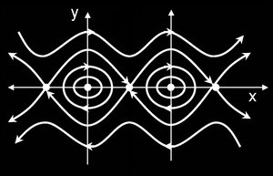 In order to draw the phase portrait, we use the fact that this system is conservative. That is, the total energy \( E(x,y) =y^2/2 - \cos(x) \) is constant along solution trajectories. This can be easily verified by differentiating \(E(x(t),y(t)) \) with respect to \(t\) and using the differential equation. Trajectories in the phase plane then represent curves of constant energy.