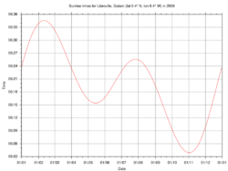 Time of sunrise in 2008 for Libreville, Gabon. Near the equator, the variation of the time of sunrise is mainly governed by the variation of the equation of time. See here for the sunrise chart of a different location