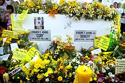 Hours after the assassination, Aquino's remains were autopsied at Loyola Memorial Chapels in Makati.[48][49] On the following day, his remains lay in state for eight days, his clothes unchanged, and no effort was made to disguise a bullet wound that had disfigured his face. In an interview with Aquino's mother, Aurora, she told the funeral parlor not to apply makeup nor embalm her son, to see "what they did to my son". Thousands of supporters flocked to see the bloodied body of Aquino, which took place at the Aquino household in Times Street, West Triangle, Quezon City, for eight days. Aquino's wife, Corazon Aquino, and children Ballsy, Pinky, Viel, Noynoy, and Kris arrived the day after the assassination. Aquino's funeral procession on August 31 lasted from 9 a.m., when his funeral mass was held at Santo Domingo Church in Santa Mesa Heights, Quezon City, with the Cardinal Archbishop of Manila, Jaime Sin officiating, to 9 p.m., when his body was interred at the Manila Memorial Park. More than two million people lined the streets for the procession. Some stations like the church-sponsored Radio Veritas and DZRH were the only stations to cover the entire ceremony.[50]