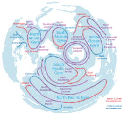 The South Atlantic Gyre is the subtropical gyre in the south Atlantic Ocean. In the southern portion of the gyre, northwesterly (or southeastward-flowing) winds drive eastward-flowing currents that are difficult to distinguish from the northern boundary of the Antarctic Circumpolar Current.[1] Like other oceanic gyres, it collects vast amounts of floating debris as a garbage patch.[2]