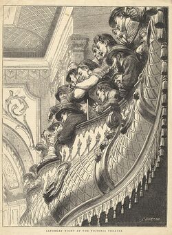 Courtly entertainments also demonstrate the complex relationship between entertainer and spectator: individuals may be either an entertainer or part of the audience, or they may swap roles even during the course of one entertainment. In the court at the Palace of Versailles, "thousands of courtiers, including men and women who inhabited its apartments, acted as both performers and spectators in daily rituals that reinforced the status hierarchy".[35]