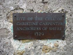 - Christine Carpenter, who submitted a petition in 1329[20] and was granted permission to become the Anchoress of Shere Church[21] (aka. The Church of St. James), in the Borough of Guildford, England. She received her food and drink from friends and family through a metal grating on the outside wall. In the interior of the church a quatrefoil shape was cut out of the wall through which she could receive the Eucharist and a hagioscope for her use for prayer and reflection. She left her cell, and in 1332 she applied again and was granted permission to be re-enclosed.[1]