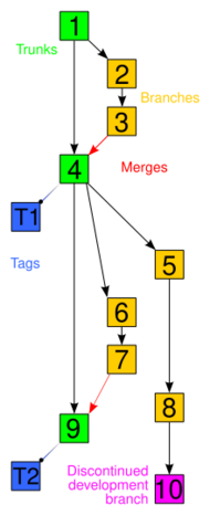 Revisions occur in sequence over time, and thus can be arranged in order, either by revision number or timestamp.[note 2] Revisions are based on past revisions, though it is possible to largely or completely replace an earlier revision, such as "delete all existing text, insert new text". In the simplest case, with no branching or undoing, each revision is based on its immediate predecessor alone, and they form a simple line, with a single latest version, the "HEAD" revision or tip. In graph theory terms, drawing each revision as a point and each "derived revision" relationship as an arrow (conventionally pointing from older to newer, in the same direction as time), this is a linear graph. If there is branching, so multiple future revisions are based on a past revision, or undoing, so a revision can depend on a revision older than its immediate predecessor, then the resulting graph is instead a directed tree (each node can have more than one child), and has multiple tips, corresponding to the revisions without children ("latest revision on each branch").[note 3] In principle the resulting tree need not have a preferred tip ("main" latest revision) – just various different revisions – but in practice one tip is generally identified as HEAD. When a new revision is based on HEAD, it is either identified as the new HEAD, or considered a new branch.[note 4] The list of revisions from the start to HEAD (in graph theory terms, the unique path in the tree, which forms a linear graph as before) is the trunk or mainline.[note 5] Conversely, when a revision can be based on more than one previous revision (when a node can have more than one parent), the resulting process is called a merge, and is one of the most complex aspects of revision control. This most often occurs when changes occur in multiple branches (most often two, but more are possible), which are then merged into a single branch incorporating both changes. If these changes overlap, it may be difficult or impossible to merge, and require manual intervention or rewriting.