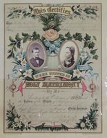 Though marriage in Australia is regulated under federal law, the of marriages takes place under the respective state or territory laws, generally through an agency named "Registry of Births, Deaths and Marriages"[2] or similar, and marriage certificates are issued by these agencies. Under Federal law, a certificate is issued at the time of marriage by a celebrant, for forwarding to the state or territory registry. A similar (sometimes cut-down) document is often given to the couple on the day of the marriage, it is generally handwritten. While legally valid as proof of marriage, is not generally acceptable as an official document. However, the state or territory marriage certificate is considered to be an acceptable and secure secondary identity document especially for the purposes of change of name, and needs to be obtained separately for a fee generally some time after the marriage. This document can be verified electronically by the Attorney-general of Australia's Document Verification Service.[3] States and territories sometimes market commemorative marriage certificates, which generally have no official document status.[4]