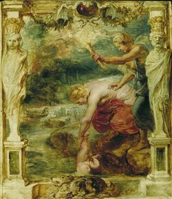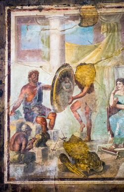 Following the death of Patroclus, who wore Achilles' armor in the fighting, Thetis comes to Achilles to console him in his grief. She vows to return to him with armor forged by Hephaestus, the blacksmith of the gods, and tells him not to arm himself for battle until he sees her coming back. While Thetis is gone, Achilles is visited by Iris, the messenger of the gods, sent by Hera, who tells him to rejoin the fighting. He refuses, however, citing his mother's words and his promise to her to wait for her return.[14] Thetis, meanwhile, speaks with Hephaestus and begs him to make Achilles armor, which he does. First, he makes for Achilles a splendid shield, and having finished it, makes a breastplate, a helmet, and greaves.[15] When Thetis goes back to Achilles to deliver his new armor, she finds him still upset over Patroclus. Achilles fears that while he is off fighting the Trojans, Patroclus' body will decay and rot. Thetis, however, reassures him and places ambrosia and nectar in Patroclus' nose in order to protect his body against decay.[16]