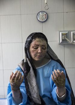 Recently, acid assault in Iran has been met with increased sanctions. The Sharia code of qisas, or equivalence justice, required a caught perpetrator of acid violence to pay a fine and be blinded with acid in both eyes.[7] One victim, Ameneh Bahrami, sentenced her attacker to be blinded in 2008. However, as of July 31, 2011, she pardoned her attacker, thereby absolving Majid Movahedi of his crime and halting the retributive justice of Qisas.[118][119]
