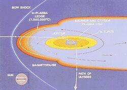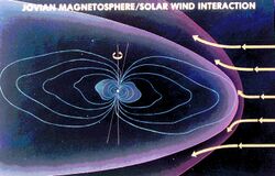 On June 24, 2016, the Waves instrument recorded Juno passing across Jupiter's magnetic field's bow shock.[3] It took about two hours for the uncrewed spacecraft to cross this region of space.[3] On June 25, 2016, it encountered the magnetopause.[3] Juno would go on to enter Jupiter's orbit in July 2016.[3] The magnetosphere blocks the charged particles of the solar wind, with the number of solar wind particles Juno encountered dropping 100-fold when it entered the Jovian magnetosphere.[3] Before Juno entered it, it was encountering about 16 solar wind particles per cubic inch of space.[3]