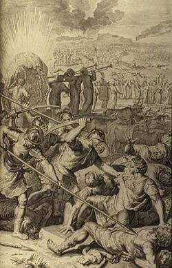 Several kings ally together to fight the Israelites. The people of Gibeon, learning of the city's destruction, tricks the Israelites into a peace-treaty.[51]:140–142 When Joshua learns of the trickery, he curses the Gibeonites (Joshua 9).[51]:133 When the king of Jerusalem hears of the treaty, he and several other kings attack Gibeon, who then call on Joshua for help. God attacks Joshua's enemies with hailstones, the Israelites are victorious, and the enemy kings are captured.[52] Joshua goes on to conquer more cities but never completes the conquest (Joshua 10).[53]