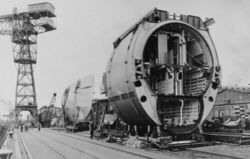 Between 1943 and 1945, 118 boats were assembled by Blohm & Voss of Hamburg, AG Weser of Bremen and Schichau-Werke of Danzig. Each hull was constructed from nine prefabricated sections with final assembly at the shipyards. This new method allowed for a hypothetical construction time of less than six months per vessel, but in practice all the assembled U-boats were plagued with severe quality problems that required extensive post-production work and time to rectify.[10] One of the reasons for these shortcomings was that sections were made by companies having little experience with shipbuilding, after a decision by Albert Speer. As a result, of 118 Type XXIs constructed, only four were fit for combat before the Second World War ended in Europe. Of these, only two conducted combat patrols and neither sank any Allied ships.[18] Post-war assessments by the US Navy and British Royal Navy also found that the completed submarines had poor structural integrity due to the manufacturing problems. This rendered the submarines highly vulnerable to depth charges, and gave them a lesser maximum diving depth than earlier U-boat designs.[16]