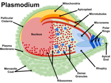 Like other apicomplexans, Plasmodium species have several cellular structures at the apical end of the parasite that serve as specialized organelles for secreting effectors into the host. The most prominent are the bulbous rhoptries which contain parasite proteins involved in invading the host cell and modifying the host once inside.[5] Adjacent to the rhoptries are smaller structures termed micronemes that contain parasite proteins required for motility as well as recognizing and attaching to host cells.[6] Spread throughout the parasite are secretory vesicles called dense granules that contain parasite proteins involved in modifying the membrane that separates the parasite from the host, termed the parasitophorous vacuole.[6]