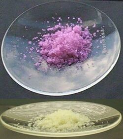 Neodymium(III) sulfate can be directly obtained by dissolving neodymium(III) oxide in sulfuric acid.[8] It is soluble in water, and its anhydrous form has a solubility of 8 g at 20˚C. Neodymium(III) nitrate can be obtained by dissolving neodymium(III) oxide in nitric acid.[9] Evaporating the resulting solution yields hydrated neodymium(III) nitrate, where the hexahydrate form is the most common. Heating the hexahydrate further will obtain the anhydrous form. Reacting neodymium(III) chloride with sodium arsenate in solution would obtain neodymium(III) arsenate,[10] which is a faint pink powder that is insoluble in water. It has good thermal stability, and its solubility product pKsp,c is 21.86±0.11.[11] Neodymium(III) oxalate is a rose-coloured crystal which decomposes from its decahydrate to its anhydrous form when heated, and when heated further, decomposes to Nd2O2C2O4,[12] and then finally obtaining neodymium(III) oxide.[13] Neodymium(III) carbonate is the carbonate of neodymium where neodymium exhibits the +3 oxidation state. It can be obtained by reacting neodymium(III) chloride with ammonium bicarbonate in water or from the hydrolysis of neodymium(III) chloroacetate:[14]