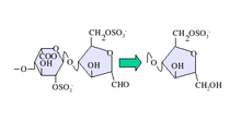 Native heparin is a polymer with a molecular weight ranging from 3 to 30 kDa, although the average molecular weight of most commercial heparin preparations is in the range of 12 to 15 kDa.[46] Heparin is a member of the glycosaminoglycan family of carbohydrates (which includes the closely related molecule heparan sulfate) and consists of a variably sulfated repeating disaccharide unit.[47] The main disaccharide units that occur in heparin are shown below. The most common disaccharide unit is composed of a 2-O-sulfated iduronic acid and 6-O-sulfated, N-sulfated glucosamine, IdoA(2S)-GlcNS(6S). For example, this makes up 85% of heparins from beef lung and about 75% of those from porcine intestinal mucosa.[48]