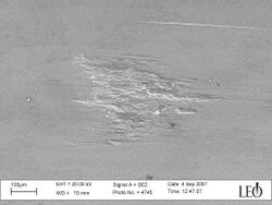 Galling is a form of wear caused by adhesion between sliding surfaces. When a material galls, some of it is pulled with the contacting surface, especially if there is a large amount of force compressing the surfaces together.[1] Galling is caused by a combination of friction and adhesion between the surfaces, followed by slipping and tearing of crystal structure beneath the surface.[2] This will generally leave some material stuck or even friction welded to the adjacent surface, whereas the galled material may appear gouged with balled-up or torn lumps of material stuck to its surface.