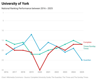In The Sunday Times 10-year (1998–2007) average ranking of British universities based on consistent league table performance, York was ranked 6th overall in the UK.[80] In 2000, the Sutton Trust named York as a leading university in the United Kingdom, placing it 6th overall.[81]