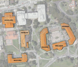 Located on the northwest end of the Berkeley campus, the college comprises six main buildings. These include the historic group of Wellman, Hilgard, and Giannini halls that composed the original college. This trio, known as the Agriculture Complex, is the most unified grouping of buildings on campus.[16] They are on the National Register of Historic Places and are visually unified by a Mediterranean landscape of olive and stone pine trees.