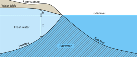 At the coastal margin, fresh groundwater flowing from inland areas meets with saline groundwater from the ocean. The fresh groundwater flows from inland areas towards the coast where elevation and groundwater levels are lower.[2] Because saltwater has a higher content of dissolved salts and minerals, it is denser than freshwater, causing it to have a higher hydraulic head than freshwater. Hydraulic head refers to the liquid pressure exerted by a water column: a water column with higher hydraulic head will move into a water column with lower hydraulic head, if the columns are connected.[4]