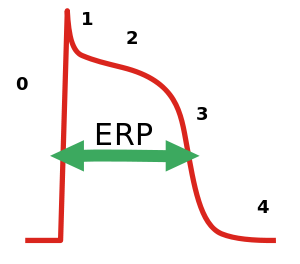 In electrocardiography, during a cardiac cycle, once an action potential is initiated, there is a period of time that a new action potential cannot be initiated. This is termed the effective refractory period (ERP) of the tissue. This period is approximately equal to the absolute refractory period (ARP), it occurs because the fast sodium channels remain closed until the cell fully repolarizes. During this period, depolarization on adjacent cardiac muscles does not produce a new depolarization in the current cell as it has to refract back to phase 4 of the action potential before a new action potential can activate it. ERP acts as a protective mechanism and keeps the heart rate in check and prevents arrhythmias, and it helps coordinates muscle contraction. Anti-arrhythmic agents used for arrhythmias usually prolong the ERP. For the treatment of atrial fibrillation, it is a problem that the prolongation of the ERP by these agents also affects the ventricles, which can induce other types of arrhythmias.