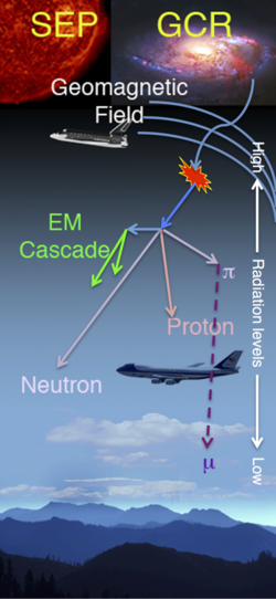 The magnetosphere guides cosmic ray and solar energetic particles to polar latitudes, while high-energy charged particles enter the mesosphere, stratosphere, and troposphere. These energetic particles at the top of the atmosphere shatter atmospheric atoms and molecules, creating harmful lower-energy particles that penetrate deep into the atmosphere and create measurable radiation. All aircraft flying above 8 km (26,200 feet) altitude are exposed to these particles. The dose exposure is greater in polar regions than at midlatitude and equatorial regions. Many commercial aircraft fly over the polar region. When a space weather event causes radiation exposure to exceed the safe level set by aviation authorities,[20] the aircraft's flight path is diverted.