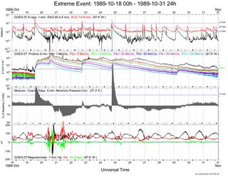 Magnetic storm activity can induce geoelectric fields in the Earth's conducting lithosphere.[22] Corresponding voltage differentials can find their way into electric power grids through ground connections, driving uncontrolled electric currents that interfere with grid operation, damage transformers, trip protective relays, and sometimes cause blackouts.[23] This complicated chain of causes and effects was demonstrated during the magnetic storm of March 1989,[24] which caused the complete collapse of the Hydro-Québec electric-power grid in Canada, temporarily leaving nine million people without electricity. The possible occurrence of an even more intense storm[25] led to operational standards intended to mitigate induction-hazard risks, while reinsurance companies commissioned revised risk assessments.[26]