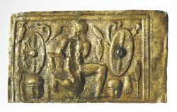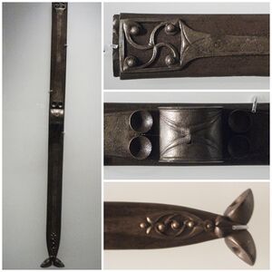 Scabbards have at least been around since the Bronze Age, and are thought to have existed as long as the blade has.[2][3] Wooden scabbards were typically covered in fabric or leather; the leather versions also usually bore metal or leather fittings for added protection and carrying ease.[2] All-metal scabbards were popular items for a display of wealth among elites in the European Iron Age, and often intricately decorated. Little is known about the scabbards of the early Iron Age, due to their wooden construction. However, during the Middle and late Iron Ages, the scabbard became important especially as a vehicle for decorative elaboration and social status. After 200 BC fully decorated scabbards became rare, but in their lesser extent existed well into the Medieval period.[2][4] A number of ancient scabbards have been recovered from weapons sacrifices, a few of which had a lining of fur on the inside.[5] The fur was probably kept oily, keeping the blade free from rust. The fur would also allow a smoother, quicker draw, and protect the blade.[2] In classical antiquity, Greek scabbards often had ornamental metal fittings, characteristic of the Iron Age.[6] The Roman army used scabbards to a great extent with short baldrics, carrying their swords quite high up.[7]