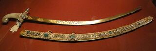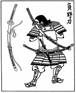 Scabbards were historically, albeit rarely, worn across the back, but only by a handful of Celtic tribes, and only with very short lengths of sword.[10] This is because drawing a long, sharp blade over one's shoulder and past one's head from a scabbard on the back is relatively awkward, especially in a hurry, and the length of the arm sets a hard upper limit on how long a blade can be drawn at all in this way. Sheathing the sword again is even harder since it has to be done effectively blind unless the scabbard is taken off first. Common depictions of long swords being drawn from the back are a modern invention, born from safety and convenience considerations on a film set and typically enabled by creative editing, and have enjoyed such great popularity in fiction and fantasy that they are widely and incorrectly believed to have been common in Medieval times. Some more well-known examples of this include the back scabbard depicted in the film Braveheart and the back scabbard seen in the video game series The Legend of Zelda. This has facilitated the modern anachronism colloquially known as a shabbard, developed by YouTuber and novel writer Shad Brooks. It uses a flat plate attached to the sheath which more easily guides even large swords into the scabbard.[11] There is some limited data from woodcuts and textual fragments that Mongol light horse archers, Chinese soldiers, Japanese samurai and European knights wore a slung baldric over the shoulder, allowing longer blades such as greatswords/zweihanders and nodachi/ōdachi to be strapped across the back, though these would have to be removed from the back before the sword could be unsheathed.[12]