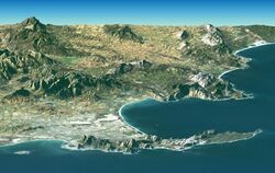 This NASA image used Landsat data to texture-map the surface created using SRTM Elevation data. The Cape Peninsula and Cape of Good Hope,