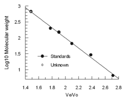 Benoit and co-workers[16] proposed that the hydrodynamic volume, Vη, which is proportional to the product of [η] and M, where [η] is the intrinsic viscosity of the polymer in the SEC eluent, may be used as the universal calibration parameter. If the Mark–Houwink–Sakurada constants K and α are known (see Mark–Houwink equation), a plot of log [η]M versus elution volume (or elution time) for a particular solvent, column and instrument provides a universal calibration curve which can be used for any polymer in that solvent. By determining the retention volumes (or times) of monodisperse polymer standards (e.g. solutions of monodispersed polystyrene in THF), a calibration curve can be obtained by plotting the logarithm of the molecular weight versus the retention time or volume. Once the calibration curve is obtained, the gel permeation chromatogram of any other polymer can be obtained in the same solvent and the molecular weights (usually Mn and Mw) and the complete molecular weight distribution for the polymer can be determined. A typical calibration curve is shown to the right and the molecular weight from an unknown sample can be obtained from the calibration curve.