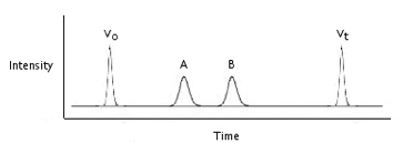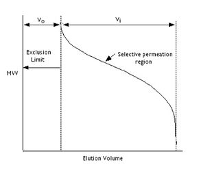 If an analyte is too large relative to the column's pores, it will not be retained at all and will be totally excluded; conversely, if the analyte is small relative to the pores sizes, it will be totally permeating. Analytes that are totally excluded, elute with the free volume outside around the particles (Vo), the total exclusion limit, while analytes that are completely delayed, elute with the solvent, marking the total permeation volume of the column, including also the solvent held inside the pores (Vi). The total volume can be considered by the following equation, where Vg is the volume of the polymer gel and Vt is the total volume:[5] [math]\displaystyle{ Vt=Vg+Vi+Vo }[/math]