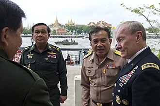 To shore up his popular support, Phibun promised elections in 1957 and then tampered with the results to ensure his victory.[39] That destroyed his popularity and even tanked his support from the military. The military launched another coup to replace him with Sarit Thanarat later that year. Sarit promoted "Nation-Religion-King" as his regime's motto, and he encouraged reverence for the king to legitimize his own rule.[40] Sarit also cozied up even more to the US in the Vietnam War and the major communist uprisings in Cambodia and Laos.